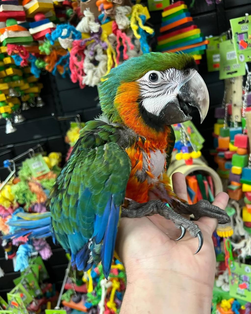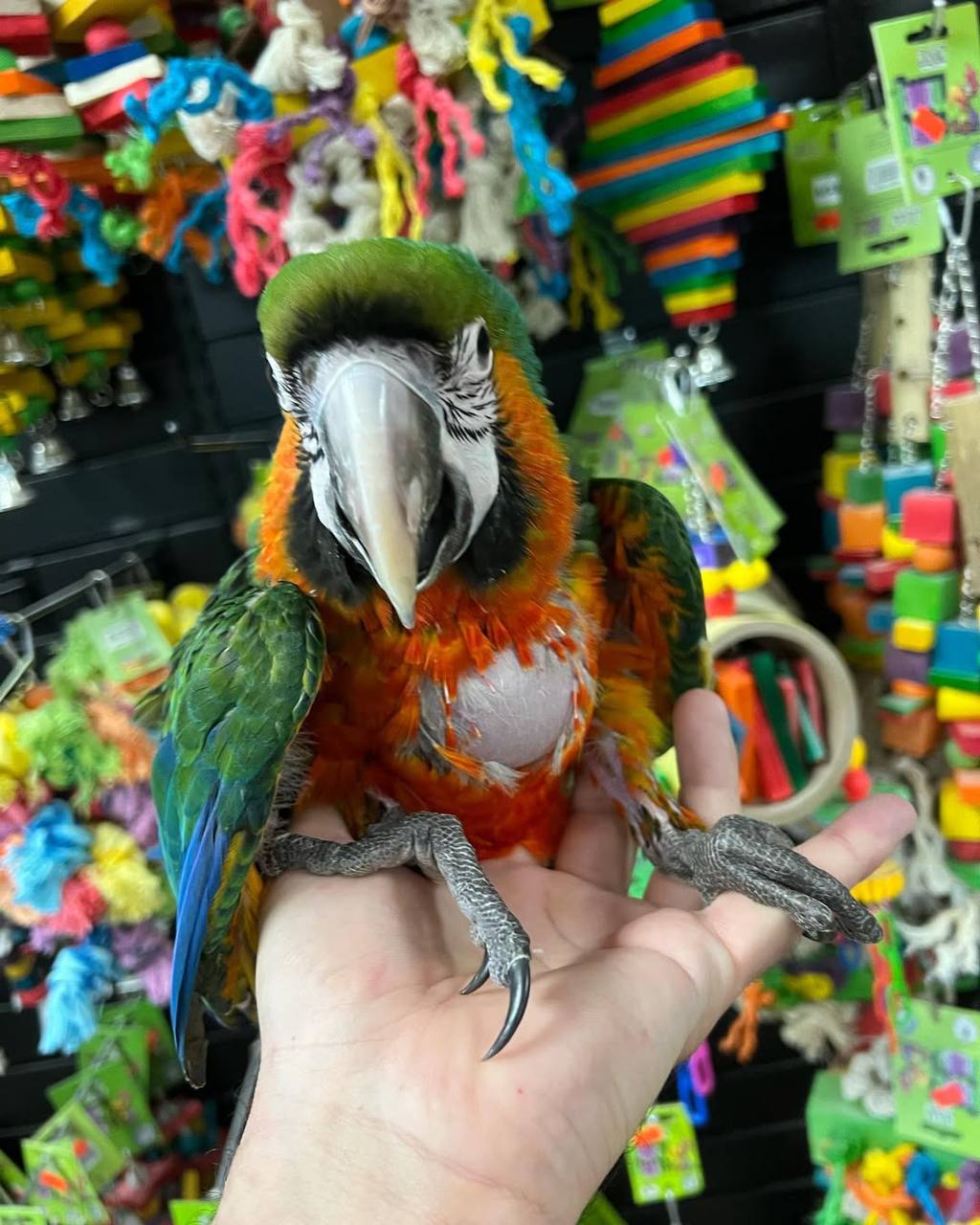 $4,000.00 RESERVE NOWThis stunning Ruby Gold Macaw Hybrid (Greenwing × Blue & Gold) is hand raised, super sweet, and full of personality. Known for their affectionate nature, intelligence, and calm temperament, they make loyal lifelong companions. Perfect for families or experienced bird lovers alike.