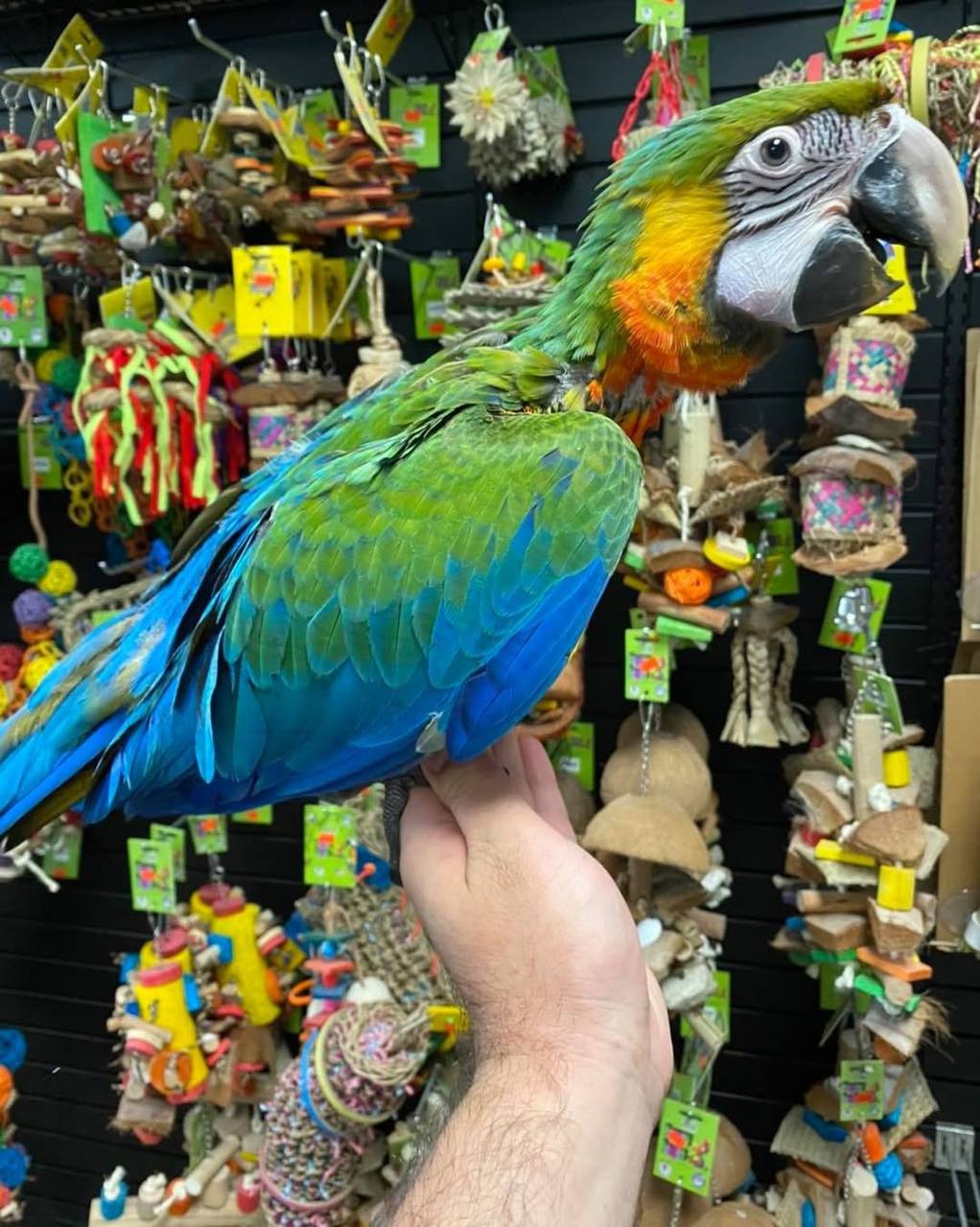 This stunning Ruby Gold Macaw Hybrid (Greenwing × Blue & Gold) is hand raised, super sweet, and full of personality. Known for their affectionate nature, intelligence, and calm temperament, they make loyal lifelong companions. Perfect for families or experienced bird lovers alike.